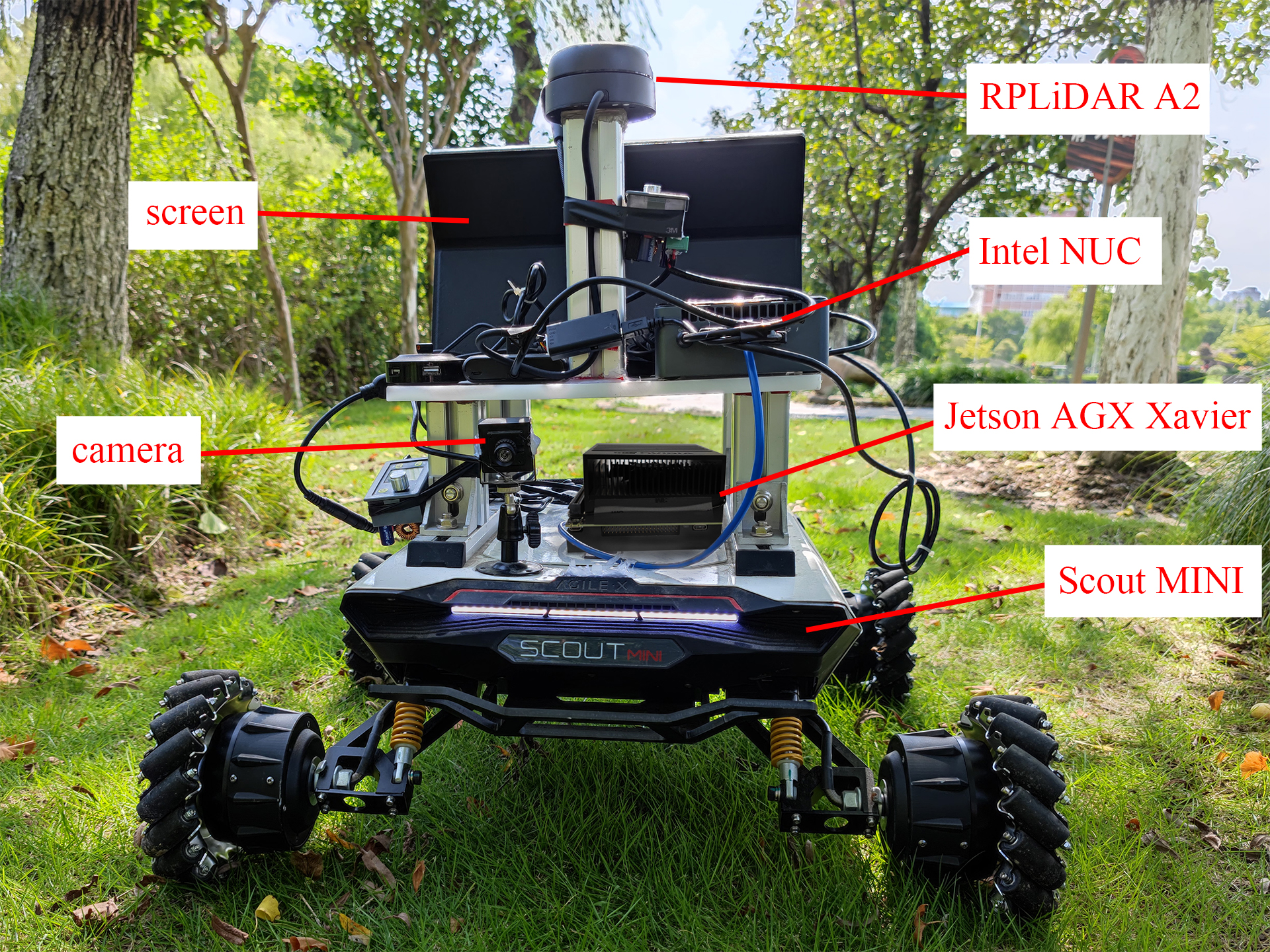(1)基于松灵底盘搭建无人驾驶平台,基于ROS实现Intel NUC工控机与英伟达Jetson Xavier的双机通讯,其中NUC实现数据采集与预处理,Xavier实现视觉模型推理;