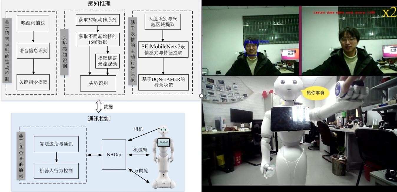 (2)使用头势识别与表情识别作为显式和隐式的奖励函数模型,使用机器人行为模型作为动作空间,通过人类情感反馈训练DQN模型,实现了机器人主动和被动地做出服务决策。相关工作整理成论文2篇。